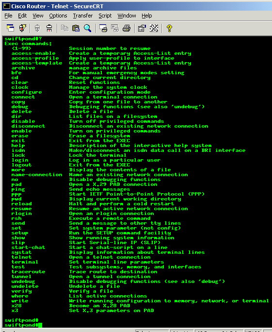 We've included a screenshot of the router to give an idea of the commands available in Privileged Mode in comparison to the User Exec Mode. Remember that these commands have sub-commands and can get quite complicated: