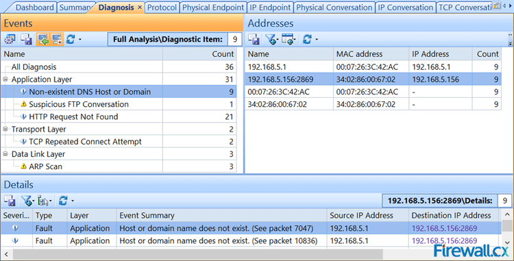 As shown in the screenshot above, our network analyzer has identified 36 events that can be examined by double-clicking on the specific event in the left window and then selecting the associated addresses from the right window. Packets are then displayed at the bottom area. Double-clicking on these packets will open them for further examination.