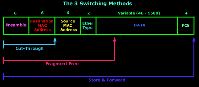 There are three primary switching methods: store-and-forward, cut-through, and fragment-free. While all three methods are analyzed in detail, the below diagram shows the portion of a receiving frame a switch will process (check), before forwarding it out its intended port(s):