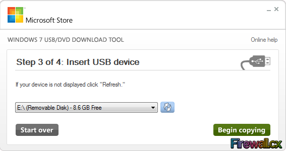 In the next screen, we are required to select the correct USB device. If there are more than one USB storage devices connected, extra care must be taken to ensure the correct USB Flash is selected. In case no USB Flash has been connected, insert it now into your USB port and click on the refresh button for it to appear: