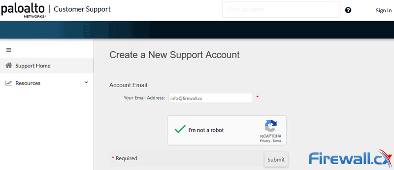 Registering your account is a simple process that only takes a few minutes. During the registration process you’ll be able to register your Palo Alto Firewall appliance and later activate your support and subscription license. To begin, visit the Palo Alto Support page https://support.paloaltonetworks.com/ and click on the Sign In link at the top right corner of the page:
